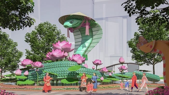 Sau 12 năm, linh vật rắn được tái hiện trở lại trên đường hoa. Trong đó, khu vực cổng chào được thiết kế cặp đôi Kim Tỵ (con cái) và Ngân Tỵ (con đực) có ngoại hình ấn tượng về kích thước cũng như cách chế tác so với dịp Tết Quý Tỵ năm 2013.