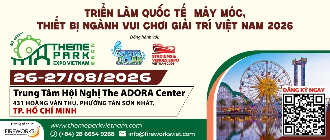 + Nhằm thúc đẩy kết nối thị trường và giới thiệu những giải pháp, thiết bị và công nghệ tiên tiến, Theme Park Expo Vietnam 2026 sẽ chính thức diễn ra từ ngày 26 đến 27 tháng 8 năm 2026 tại The ADORA Center (431 Hoàng Văn Thụ, Phường Tân Sơn Nhất, TP. Hồ Chí Minh).